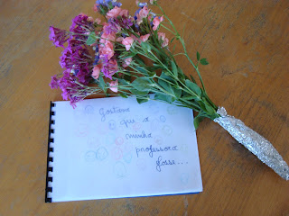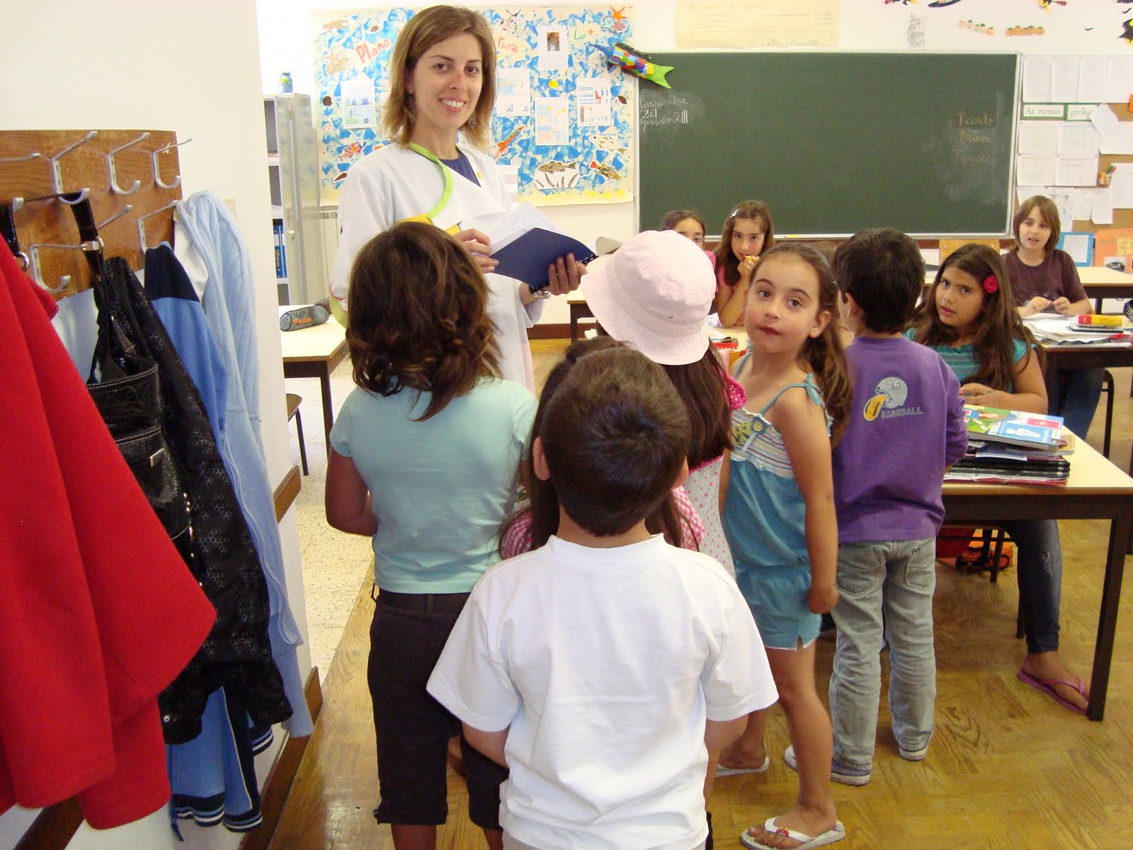 "Hoje fomos conhecer a professora Mariana, que se calhar, vai ser a nossa professora na escola primária. É uma professora muito simpática e temos que a tratar por D. Professora Mariana... É preciso respeito e cumprir as regras, para não zangar a professora e não ficarmos de castigo... Para a professora Mariana, fizemos um livro a dizer o que pensamos da escola primária, como gostávamos que a nossa professora fosse e com desenhos... Para a professora Mariana, foi a Íris que trouxe flores".