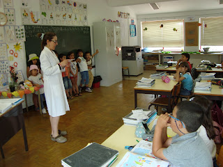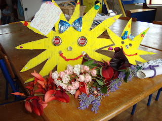 "Primeiro, fomos visitar a professora Albertina e os meninos, para lhes desejar umas boas férias e também para agradecer eles terem trabalhado connosco... Fizemos um sol e, o Paulo Jorge, trouxe flores de casa para oferecer à professora Albertina... Também escrevemos uma mensagem: Aproveitem as férias para ir à praia, brincar com a família e os amigos, ir ao parque, ao circo, a um SPA, comer gelados, fazer piqueniques... Nas férias, devemos fazer tudo o que gostamos".