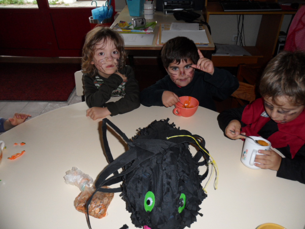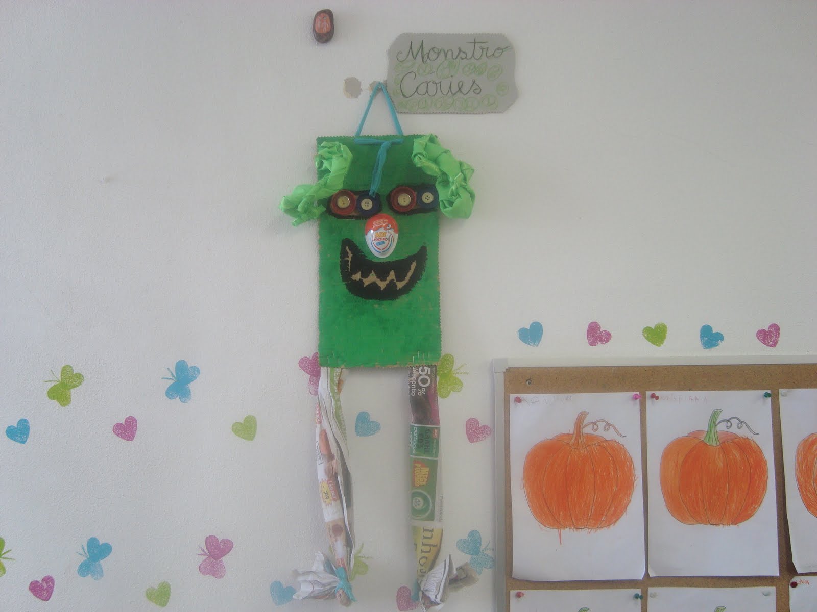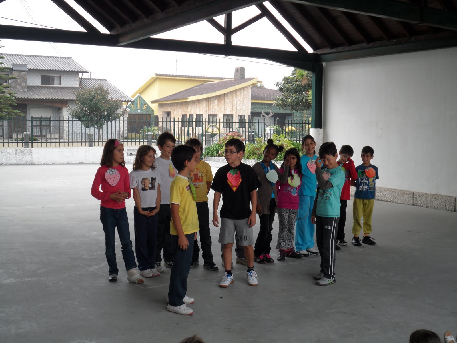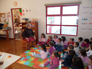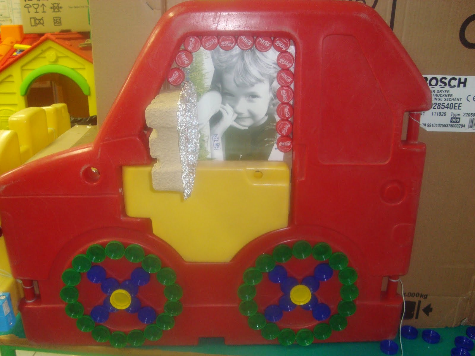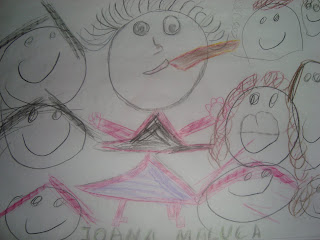 "O nosso carro é ecológico, feito de materiais recicláveis... Aproveitámos caixotes e as "coisas" do recreio, amarradas com fios... Falta um motor, que serve para andar, mas não vamos fazer... O fumo sai do escape... É um tubo que o Francisco trouxe num saco... A capota ou tejadilho está feita com copos e garrafas de iogurte... Tem os vidros com tampas à volta e os vidros servem para vermos, quando conduzimos... O vidro da frente, o para-brisas, tem o limpa para-brisas, para quando chove... Tem garrafas de água, sem água, a fazer a mala do carro... As rodas servem para andar e dum lado até eram da trotinete... Também vai ter luzes, para os outros carros verem e não baterem... Também vai ter para-choques, feito com os nossos pacotes de leite... Tem espelhos retrovisores, para vermos as coisas detrás para a frente... Tem uma antena, para o rádio dar melhor som, para ouvirmos música... Os carros têm um volante para conduzir e bancos para as pessoas se sentarem... Os bancos têm cintos de segurança... Também têm mudanças para andar rápido ou muito lento... O condutor guia o carro e as outras pessoas são os passageiros... Os carros andam na estrada e as pessoas devem andar nos passeios, para não serem atropeladas... Os carros têm travões, para travar e um acelerador, para andar mais rápido... Também precisam de chaves, para andar e abrir e fechar as portas... Os carros poluem, era preciso inventar carros que não fizessem fumo... A poluição faz mal ao planeta... Os condutores devem respeitar os semáforos e os sinais de transito"...